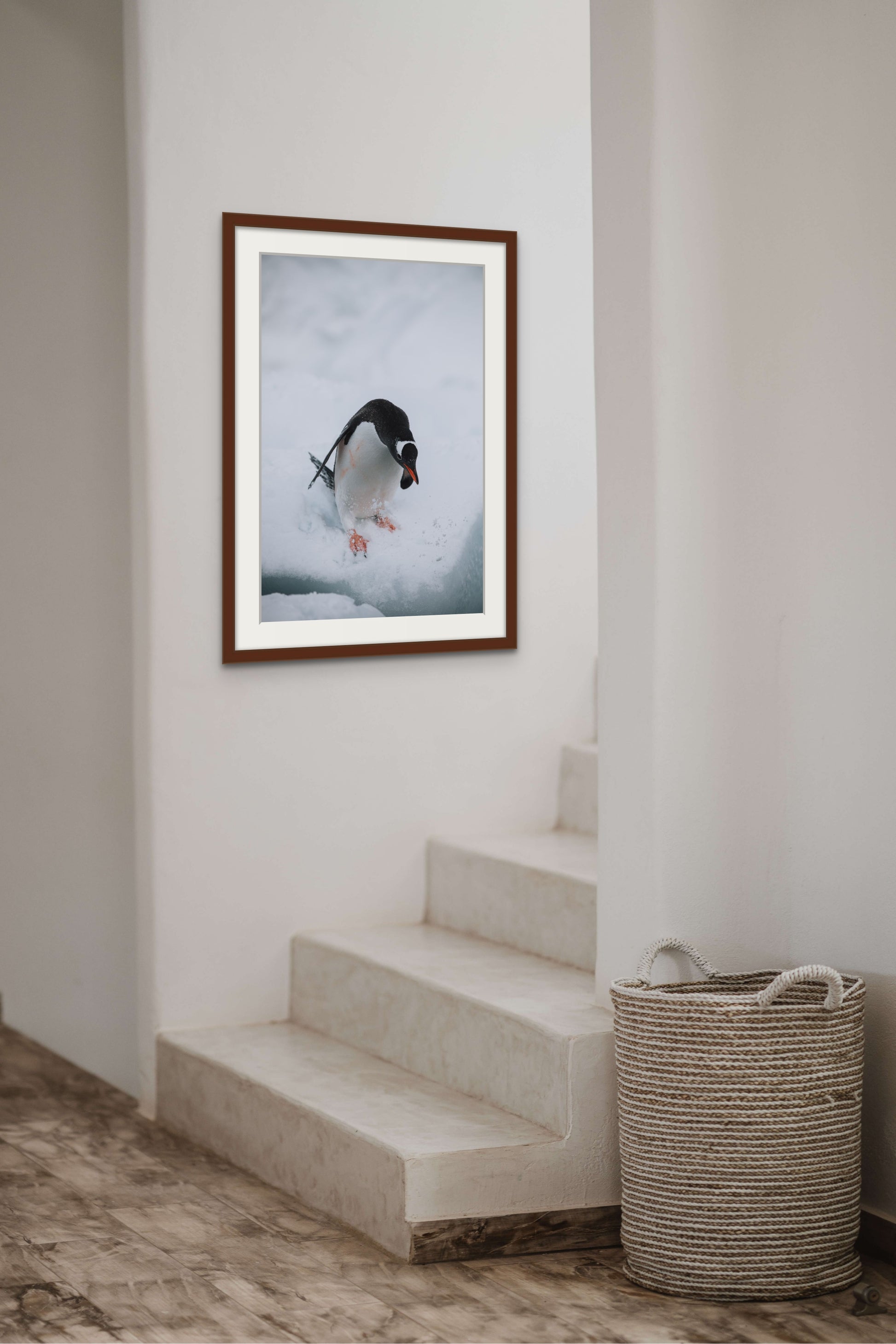 Captured just before plunging into the water, this charming Gentoo penguin grapples with the soft, powdery ground.